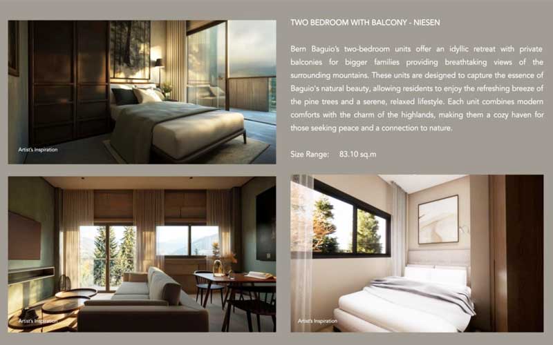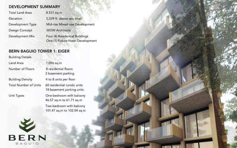 View floor plans, location maps, and property photos for Bern Baguio Condominium. Get a closer look at the facade, sky amenities, and unit layouts for Niesen Tower-2. Pre-selling units available with turnovers starting in Q4 2029